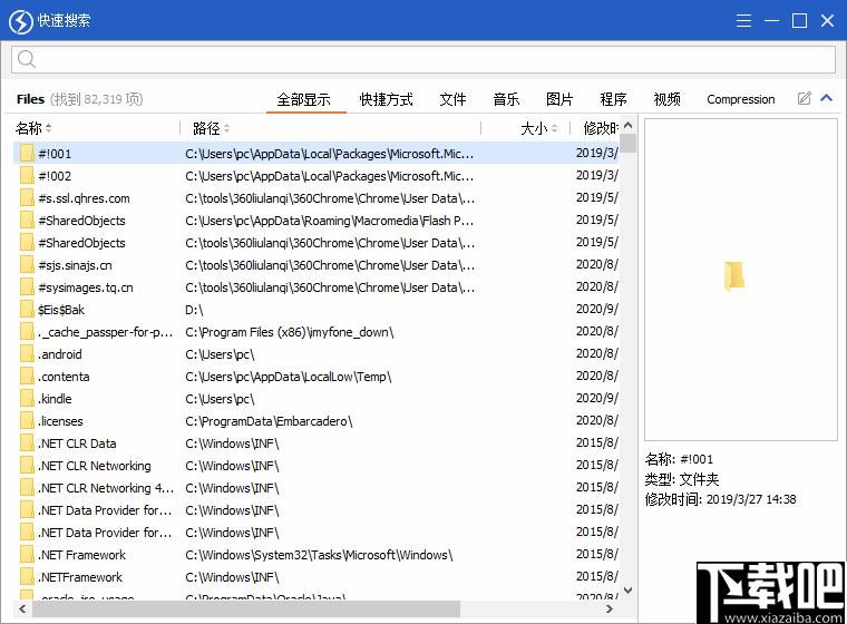 3、在输入框中输入关键字,软件立即将系统中所有相关的文件调出来。